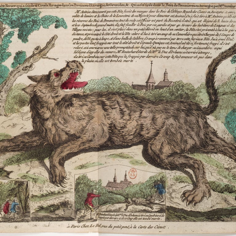 Le cronache dell’epoca — conservate nell’Archivio Nazionale Francese, nei rapporti dei Dragoni Reali, nelle lettere del Marchese d’Apcher e nei giornali del tempo — descrivono un animale troppo grande per essere un lupo, dotato di una forza e di un’intelligenza anomale, capace di sfuggire a ogni tentativo di cattura nonostante gli sforzi della monarchia.